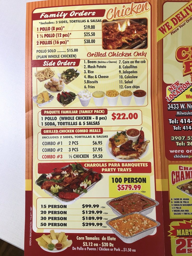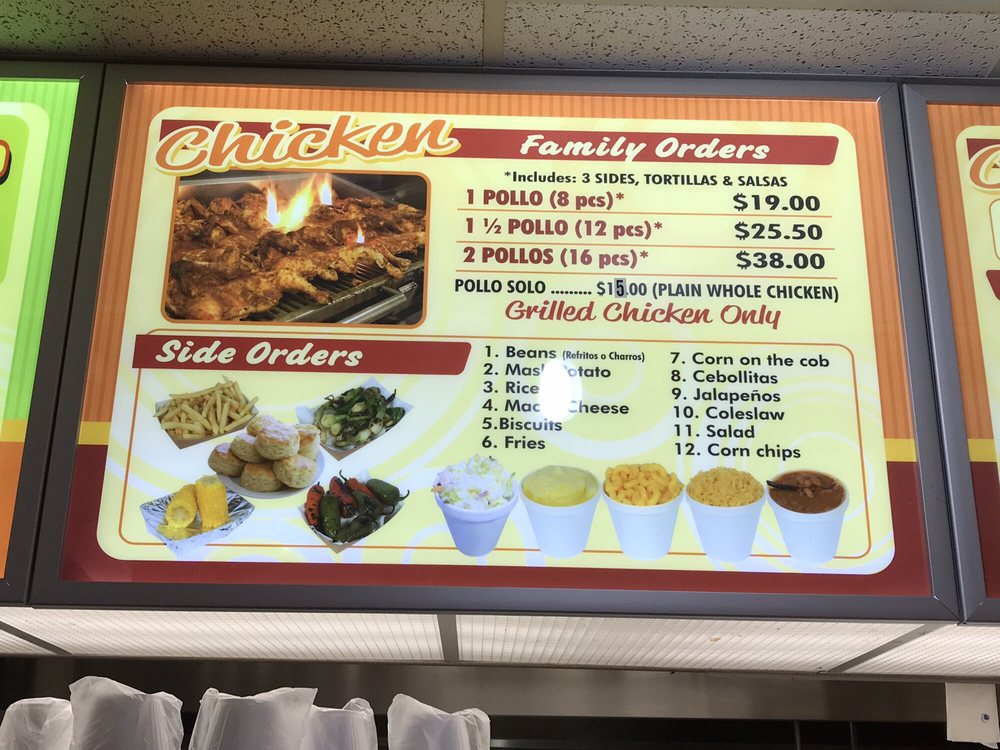 2 chicken 2 sides. Incluye tortillas y salsas. Includes tortillas and salsas.